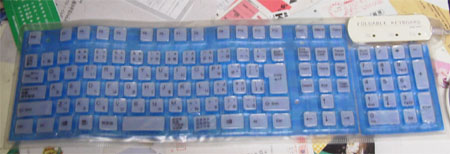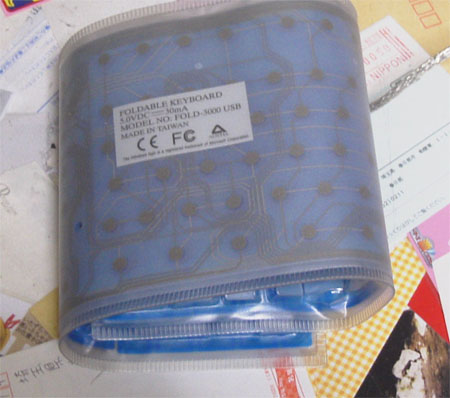 上の写真のようなキーボードだが、下の写真のように折りたたむことができる。 実際には、床が固くないと使えないし、うちにあるものだと長いこと折りたた んであるため折りめがついてしまい、どうしてもちゃんと伸びないのですごく 使いづらいとか、いろいろ問題はある。イロモノとしては面白いけどね。