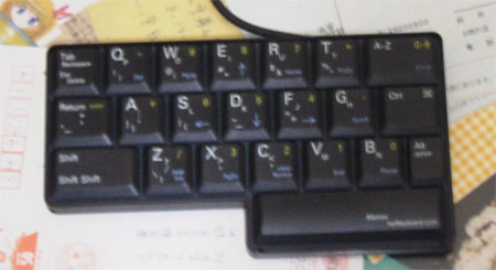 このキーボードには、英字部分の左半分しかない。では右側はどうするのかと いうと、スペースバーを打ちながら打つ。例えば[SPC]+w で"o"が入力できる。 数字については、numキーを2回たたいてから入力、記号ならSHIFTを2回たたい てから入力、といった具合。 慣れるまではなかなか難しいが、慣れてしまえばそれなりの速度での入力は可 能だった(いちご打ノーマルモードクリアはまだ出来ていないが :-)