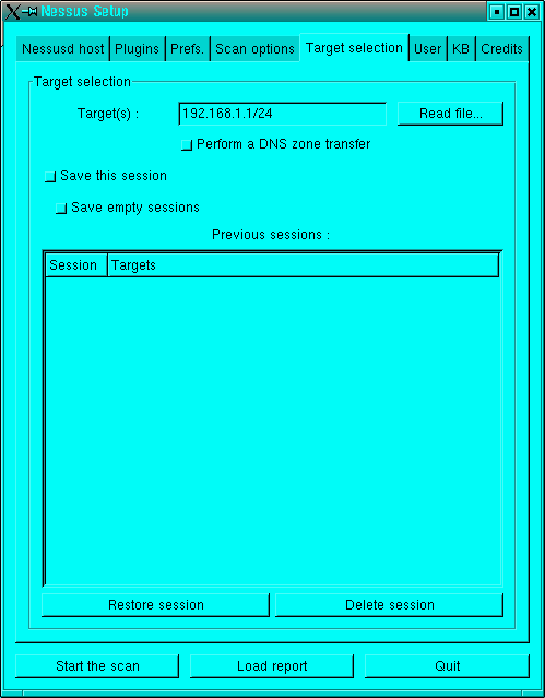 つづいて Target selectionタブを押して、検査するホストやネットワークを