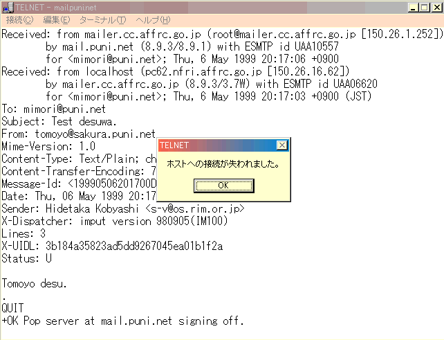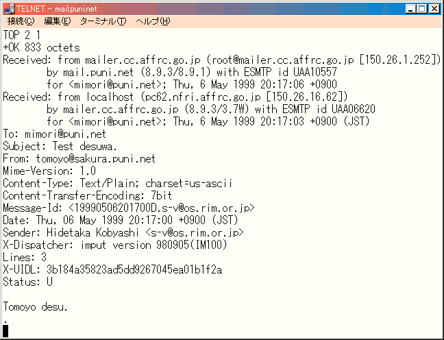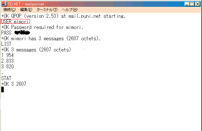 ここでも POP server を mail.puni.net, ユーザ名を mimori としましょう。 接続 ですが POP はポート番号を 110 にして telnet してください。