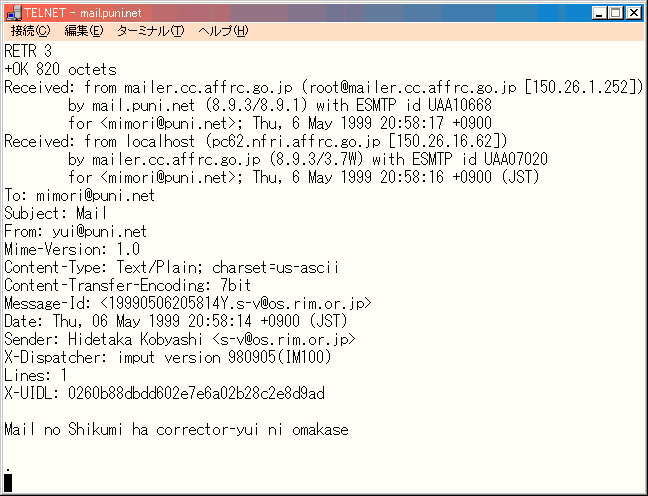 さぁ、ついにメールを読みましょう。メールを見るには RETR というコマンドを 使います。先の3番目のメールをみたいなら
