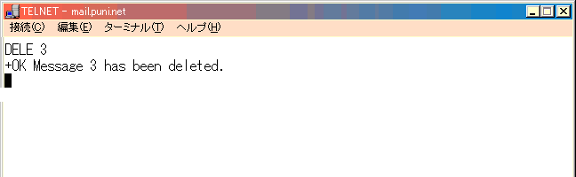 また、読み終わったメッセージを消すにはDELE を使います。 特にメール爆弾やSPAM などに苦しめられた時には、後に述べるTOP と併用すると 効果的にメールボックスを空にすることが出来ます。 例に、先程の3番目のメッセージを消してみましょう。