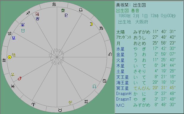 月は乙女座にあるが、射手座の海王星と強いスクエアを形成している。更に海王星は天秤座の冥王星とセクスタイルの関係にある。基本的には清潔癖かつ神経質なところがある。対人関係では控えめな態度を取っているのだが、一旦、深い関係になると、相手と自分の境界を見失いそうな雰囲気も漂っている。