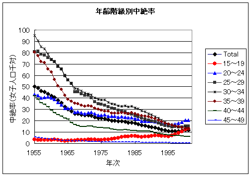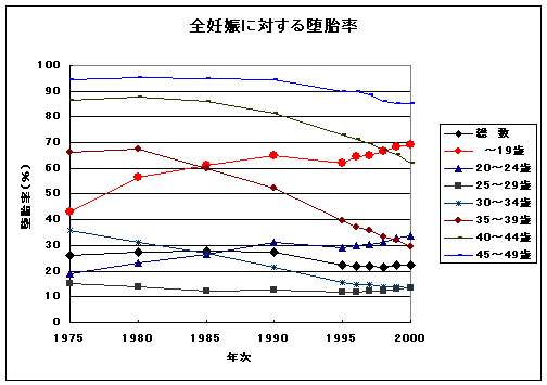 「人口動態特殊報告」には、年齢層別出生数が記載されている。この数字を用いて中絶数/(中絶数+出産数)」(=「堕胎率」)を計算してみる。これは本来生まれるはずだった子供のうち、どれくらいが親の都合で中絶されたかを示すものである。長期的なスパンで見ると30代以上は昔より子供を「生む」方を選ぶようになってきている。これに対して24歳以下、特に19歳以下の層ではむしろ「堕ろす」傾向が強まっている。