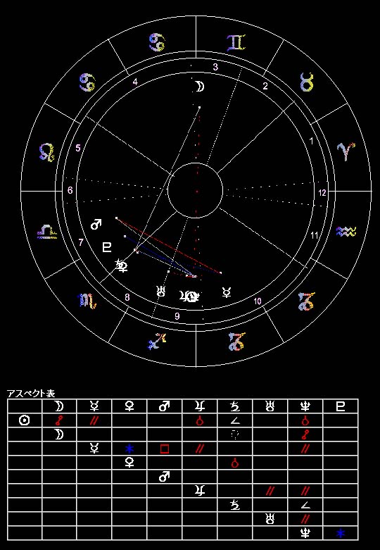 恋愛を示すハウス7に火星・土星・冥王星が入っている。火星の象徴する熱烈的な恋愛に走る傾向があるが、一方でそれは冥王星が象徴するトラウマによって、相手と深く関わることに恐れを持っている(←土星の抑制作用)ためと理解できる。