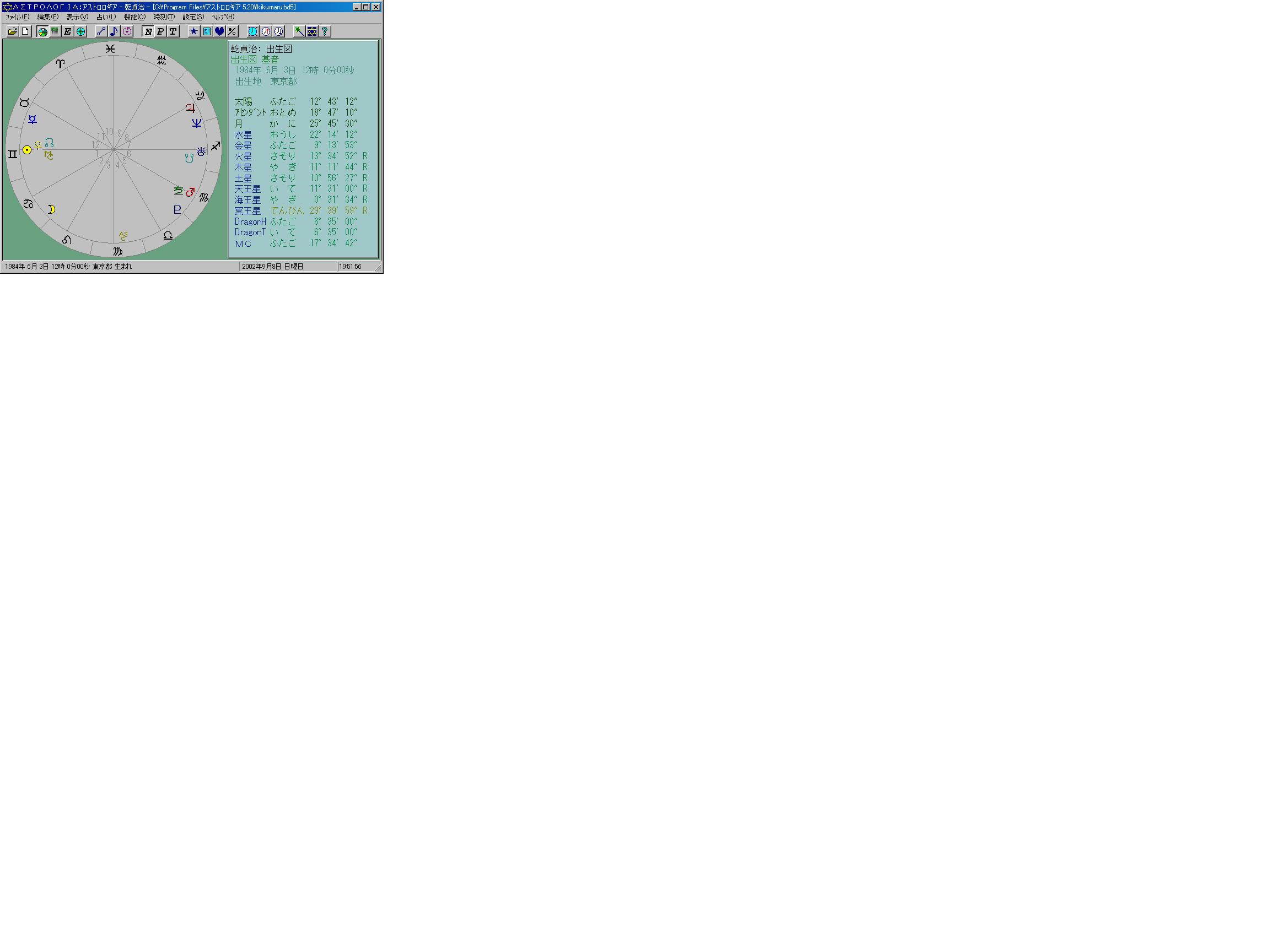 太陽は双子座に入っている。一般的にこの星座生まれの人は好奇心旺盛で非常に知的でクール。物事に熱中していても、どこか醒めている面がある。金星が同じ星座でコンジャンクションしているために、理性的な面に美的な感覚が加わり、機知と洞察力と独創性に富む。しかしその独創性の強さが裏目に出る可能性を、コンジャンクションしている天王星が示している。